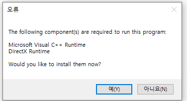 3. 실행파일(게임) 실행 시 아래와 같은 오류 문구가 뜨는데 예(Y)를 통해 설치해준다.