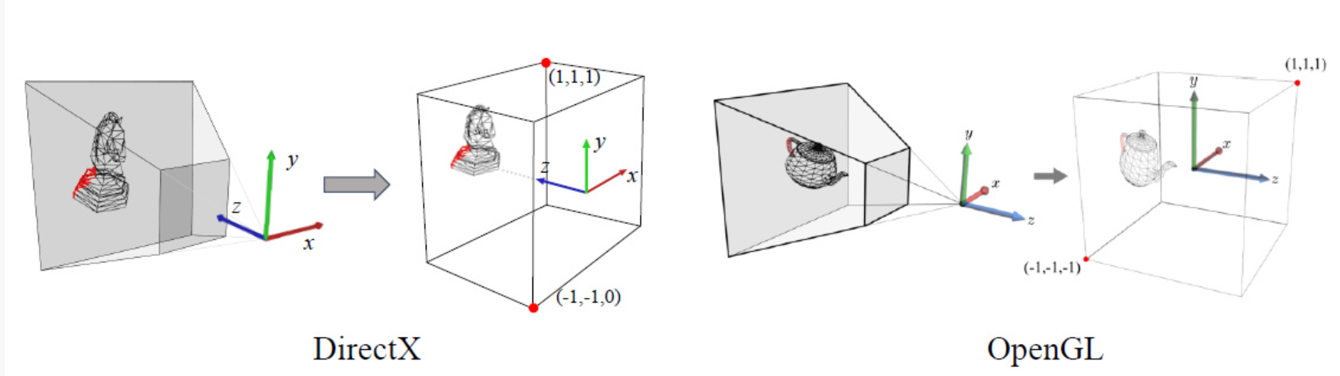 - DirectX 기준: x: [-1, 1], y: [-1, 1], z: [0, 1] 범위의 2x2x1 크기 큐브.
