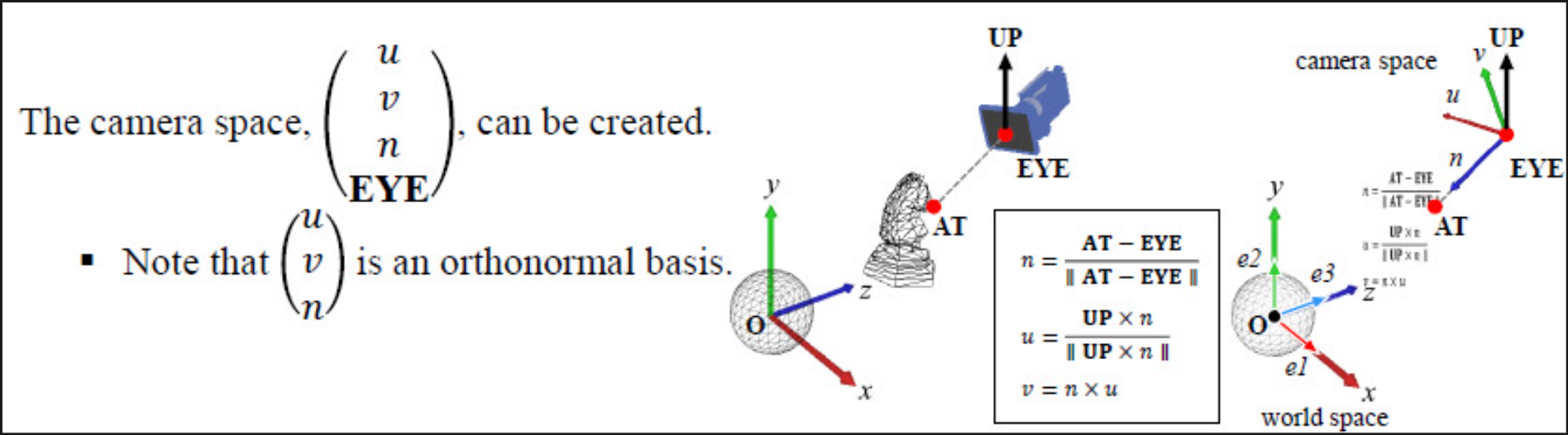 - Camera Space는 (u, v, n, EYE), World Space는 (e1, e2, e3, O)