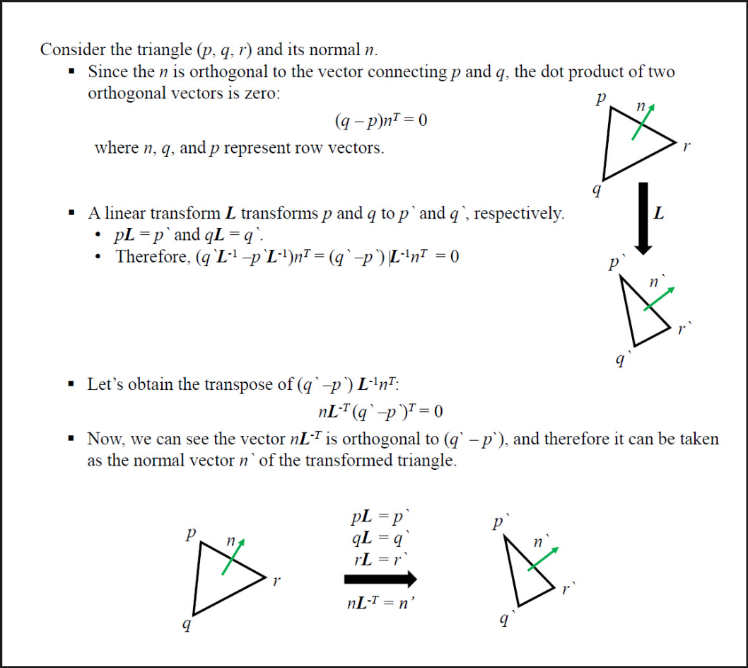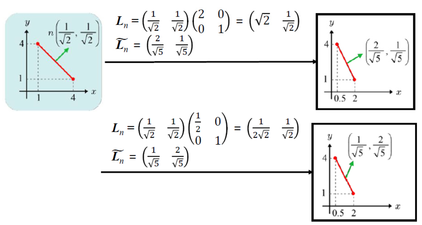 이 행렬을 사용하면, 비균일 스케일링으로 표면이 찌그러지더라도 법선은 항상 변형된 표면에 정확히 수직인 방향을 유지할 수 있다.