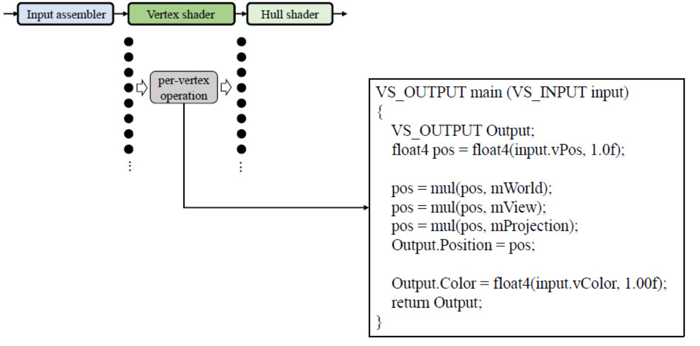IA가 조립한 모든 정점(Vertex)은 파이프라인을 통해 각 정점 당 정점 셰이더 프로그램이 한번씩 실행된다. (per vertex Operation)