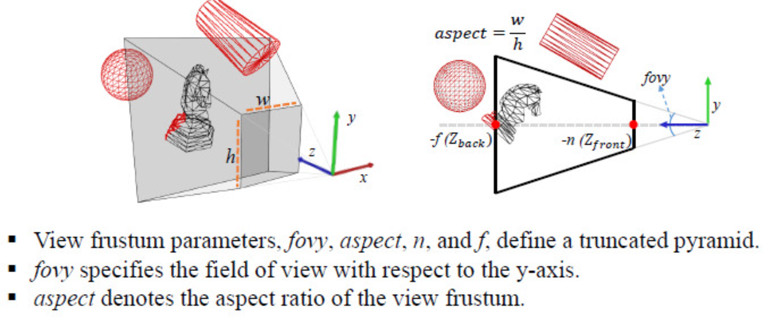 - 이 영역은 일반적으로 카메라의 위치(EYE)를 꼭대기로 하는 사각뿔(Pyramid)에서 앞부분(Near Plane)과 뒷부분(Far Plane)을 잘라낸 모양 절두체 모양.