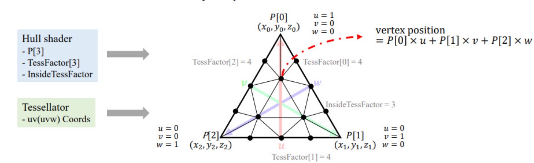 - To 도메인 셰이더 (DS): 생성된 새 정점들의 좌표 (Domain Coordinates).