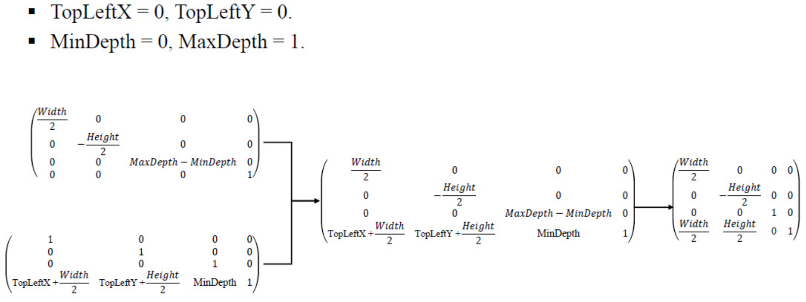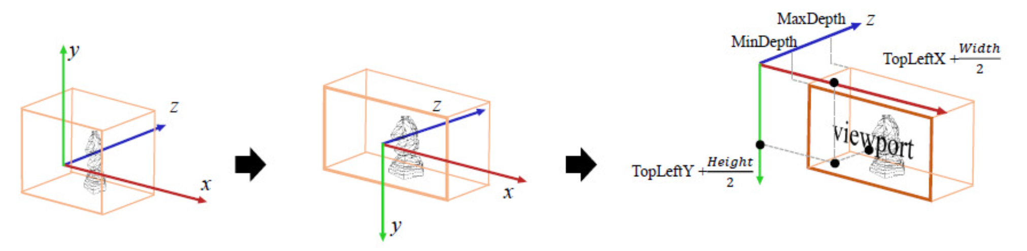 - Z 좌표(깊이 값) 역시 뷰포트에 설정된 깊이 범위(예: 0.0 <= z <= .0)로 변환된다.