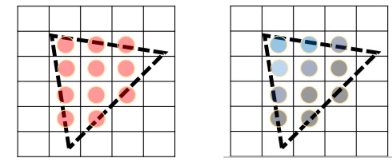 - 삼각형 내부에 중심이 포함되는 모든 픽셀을 식별한다.