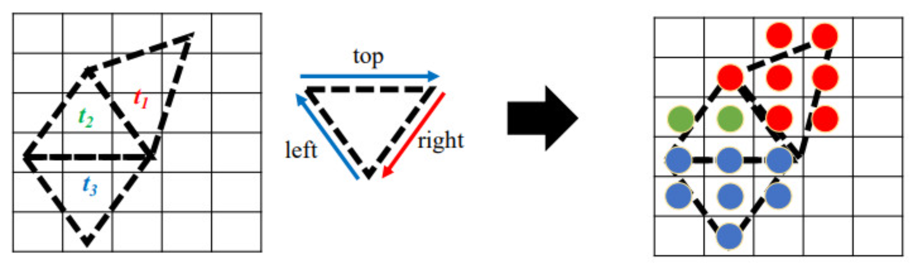 - Direct3D는 상-좌 규칙(top-left rule)을 채택하여, 이 규칙에 의해 픽셀이 삼각형의 상단 또는 왼쪽 모서리에 위치하면 해당 픽셀이 삼각형에 속한다고 명시한다.