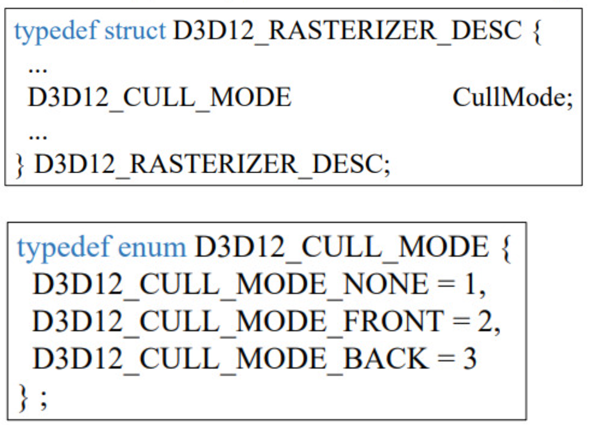 - D3D12_CULL_MODE_BACK: 시계 방향(뒷면)인 삼각형을 제거한다. (가장 보편적)