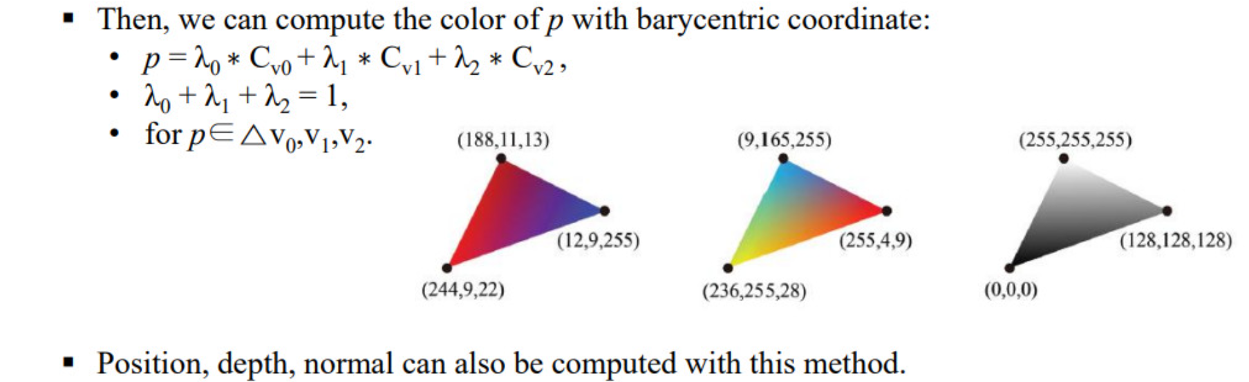 - 래스터화 과정에서 생성된 삼각형 내부의 각 프래그먼트는 이 데이터가 필요하다.
