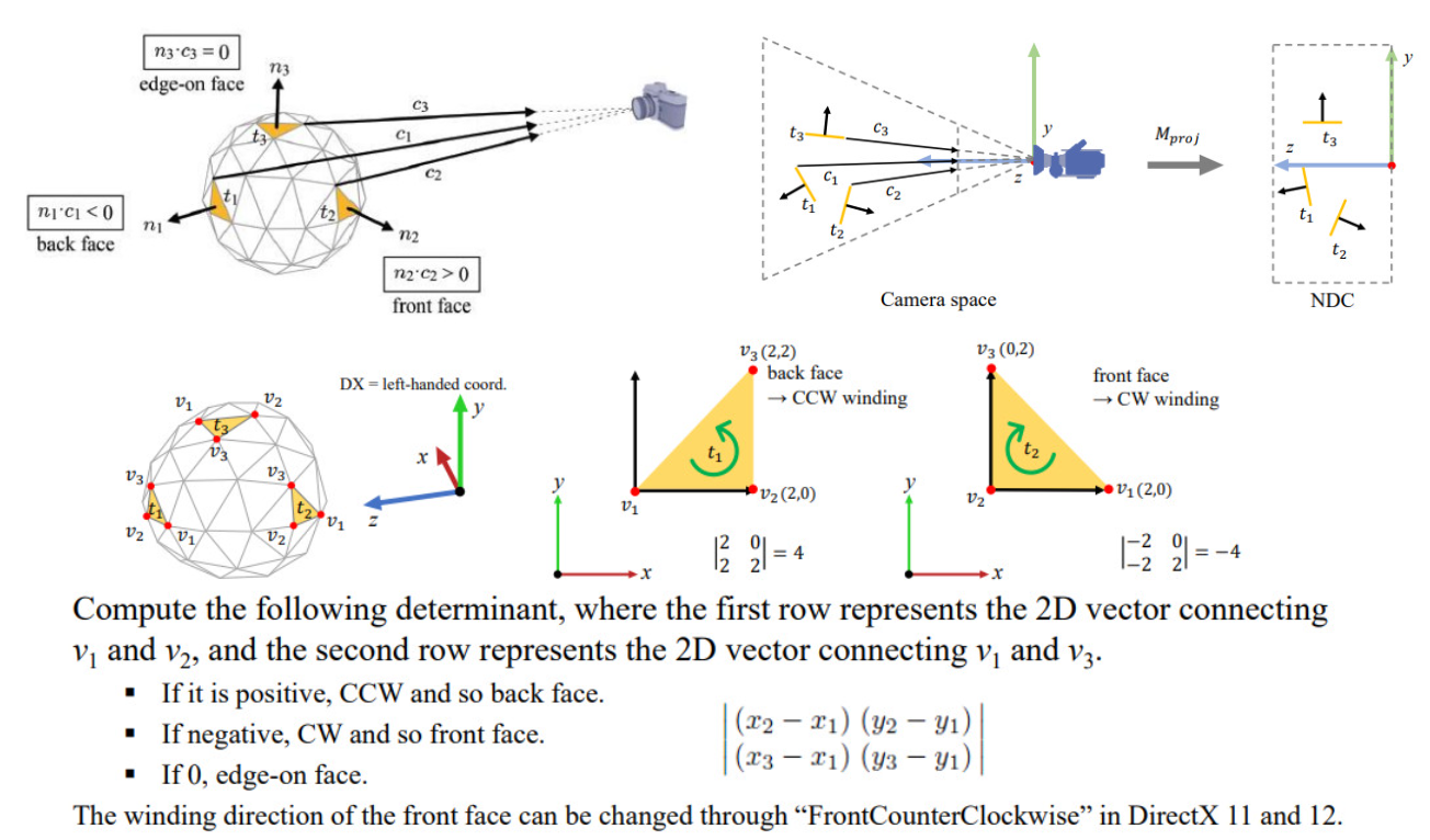 - 뷰포트 변환까지 마친 2D 픽셀 좌표를 기준으로, 삼각형을 구성하는 3개 정점의 순서(Winding Order)를 검사한다.