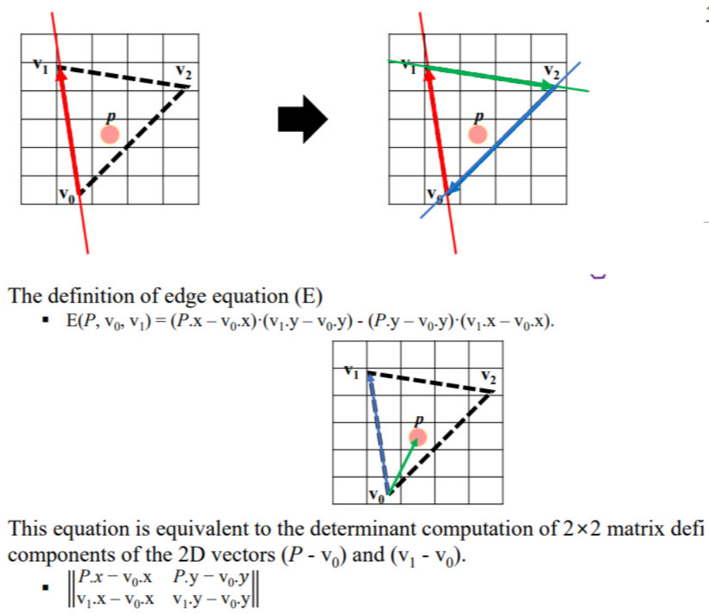 세 모서리를 기준으로 Edge Equation을 적용했을 때, 결과가 모두 양수 또는 0인 경우 픽셀은 내부, 단 하나라도 음수인 경우 픽셀은 외부의 점이다.