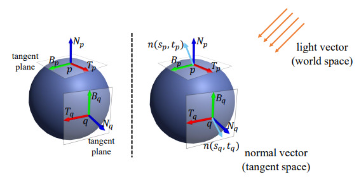 하지만 노멀 매핑을 사용할 때, 우리는 두 개의 서로 다른 공간에 있는 벡터를 계산해야 하는 문제에 부딪힌다.