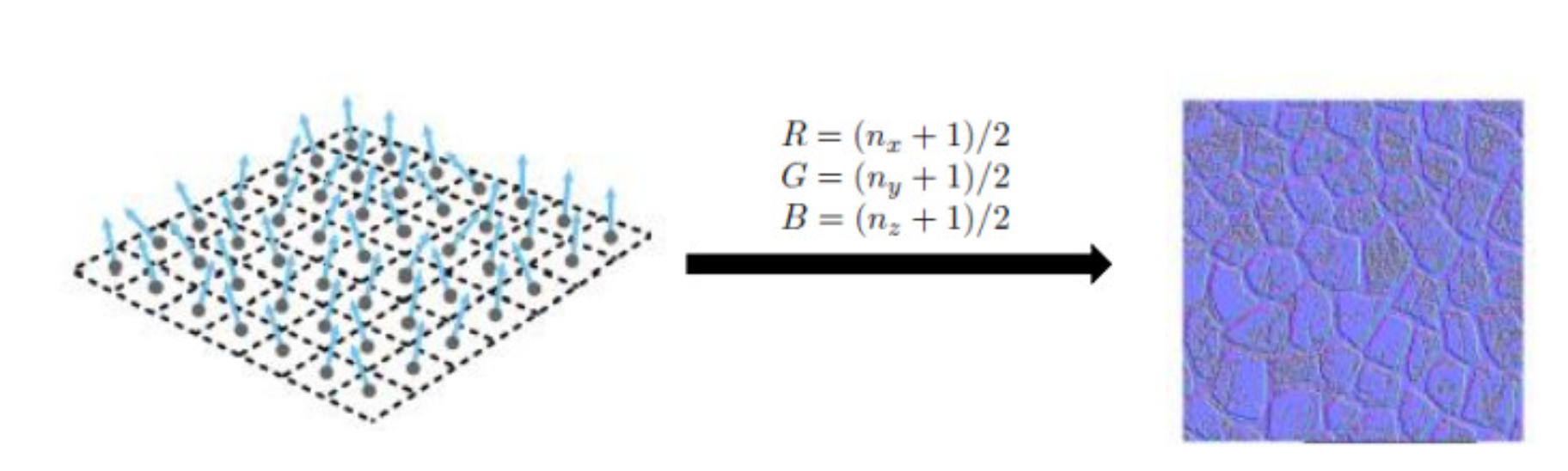 - 이 텍스처의 각 픽셀(텍셀)은 RGB 채널을 사용하여 3차원 방향 벡터(Vector) 정보(X, Y, Z)를 저장한다.