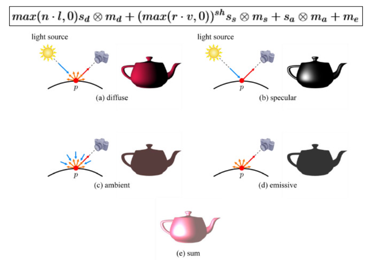 - Diffuse (확산), Specular (반사), Ambient (주변), Emissive (방출)