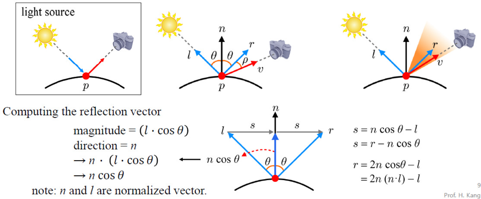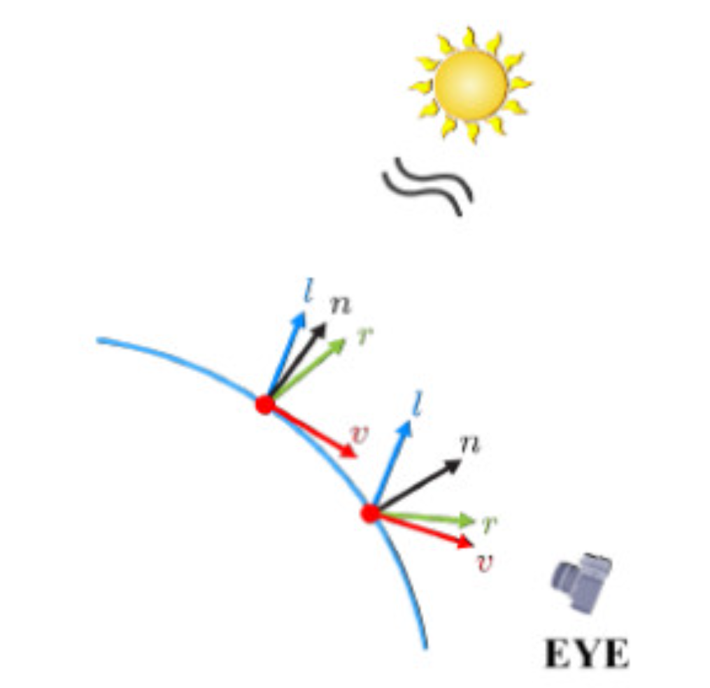- 시선 벡터(V)와 광원의 반사 벡터(R)를 사용하거나, 더 효율적인 블린-퐁(Blinn-Phong) 모델에서는 하프웨이 벡터(H)를 사용한다.