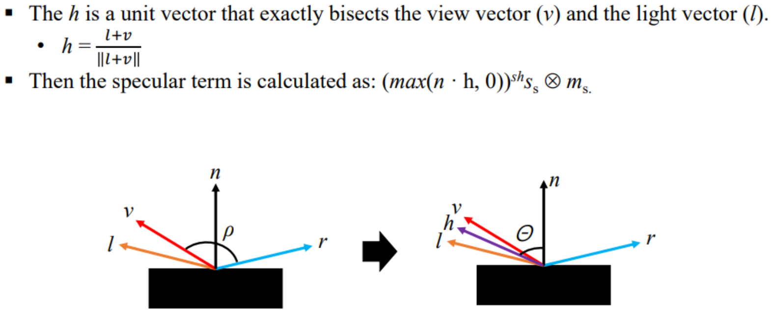 Blinn-Phong reflection model에서는 reflection term이 반사 벡터가 아닌 harfway vector (h)에 의해 계산된다.